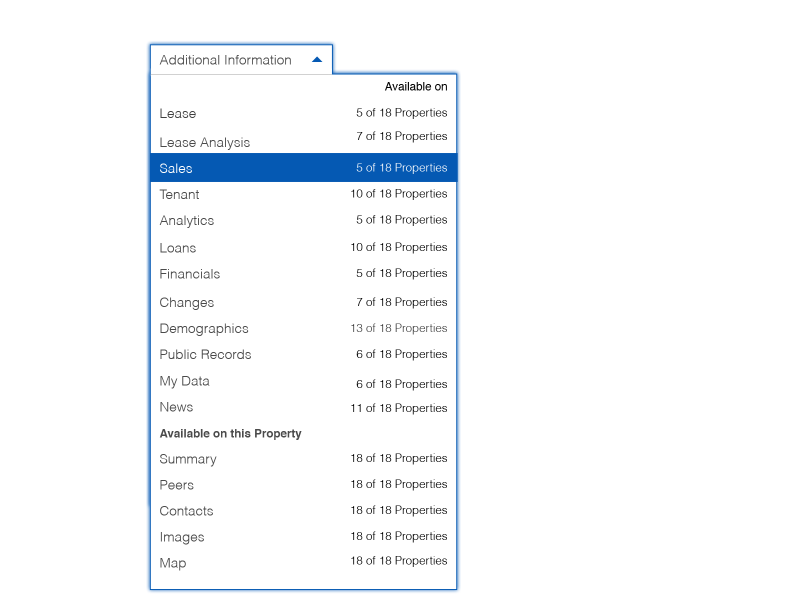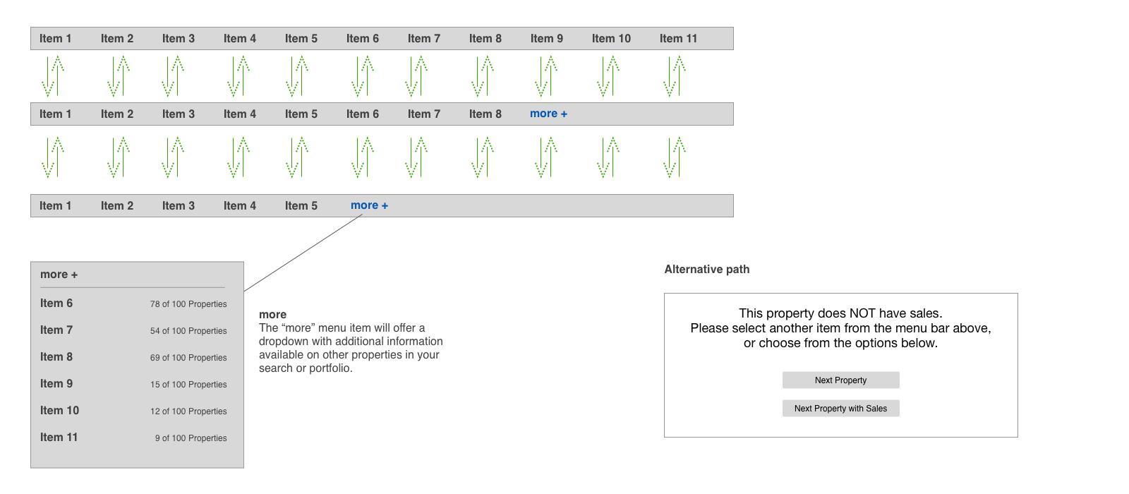 Problem: As we expand into new markets, our data is going to be limited. Many property tabs will have no data. We fear this will lead to a poor user experience. Also, while we can navigate and paginate to all information types in a property with all information types available, we can’t navigate or paginate from a property with fewer information types to a property with more information types without them both having that information type in common.