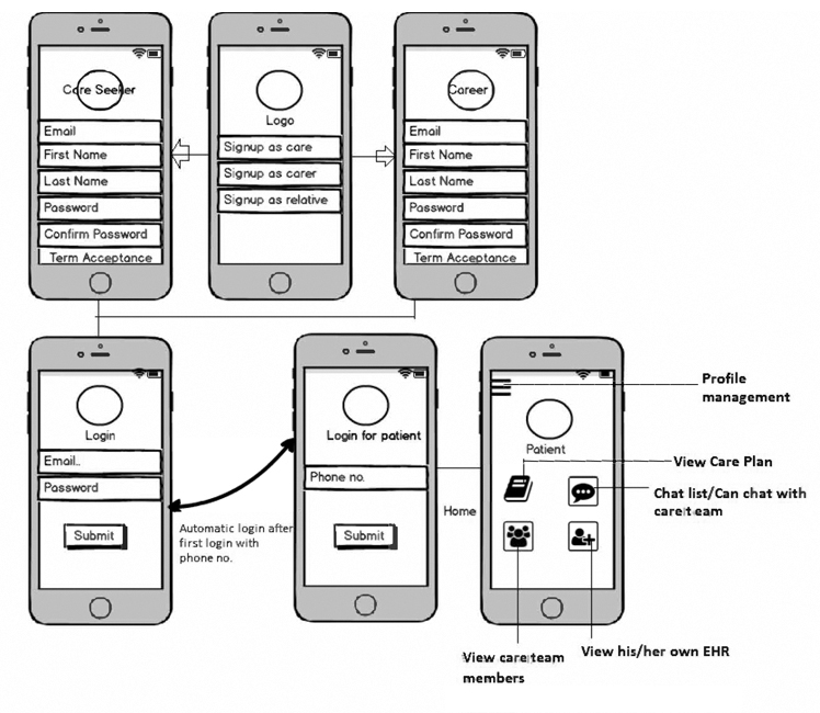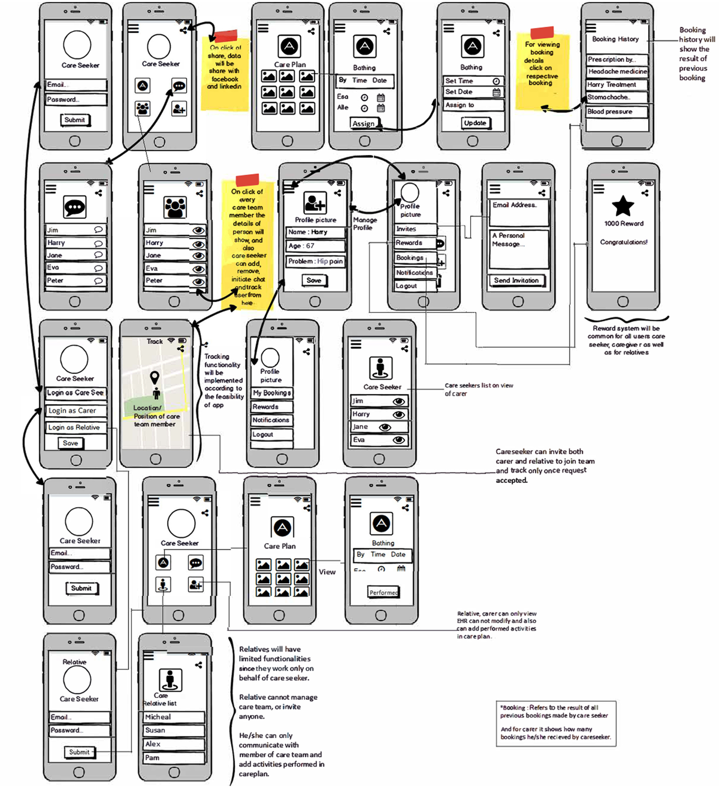 This wireframe outlines the functions of the app from initial engagement to service booking and monitoring. The app connects care seekers with caregivers. All authorized parties can instantly access medical records and care history. Care seekers may live independently or with a relative but require assistance and/or occasional monitoring. A care seeker can schedule appointments for services such as bathing, treatments, daily blood pressure testing, etc. Additionally, this app enables care seekers and relatives to track caregivers as they arrive and depart.