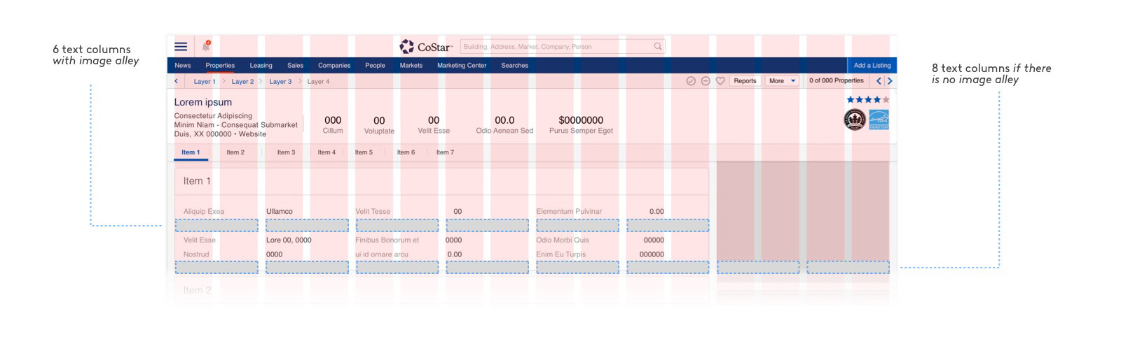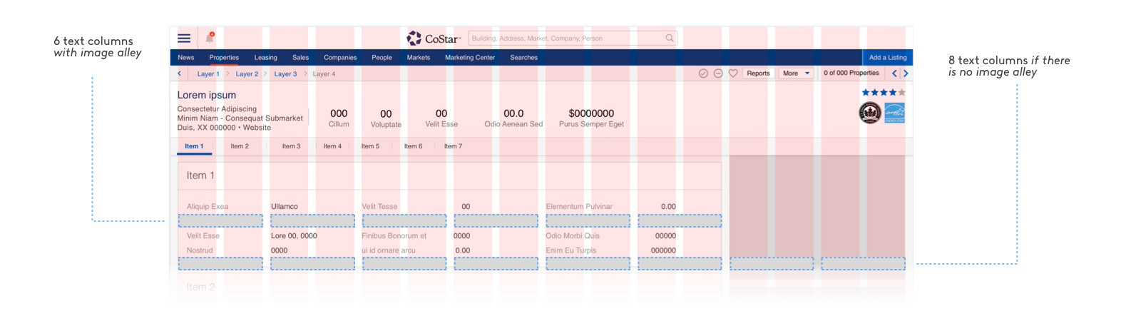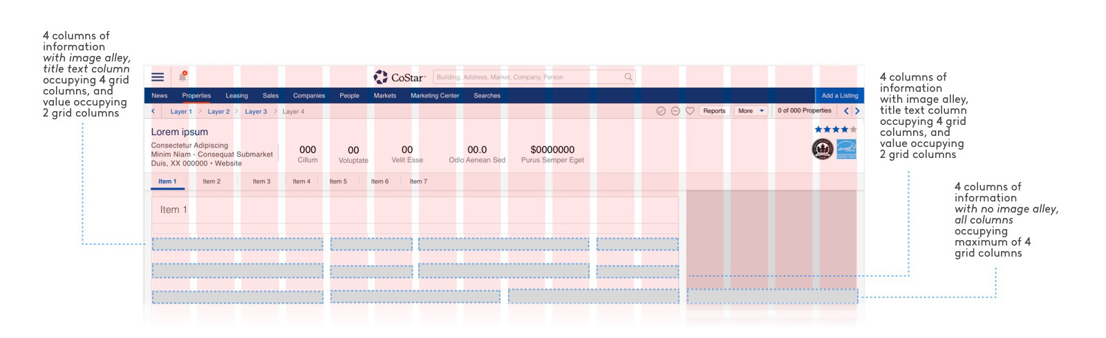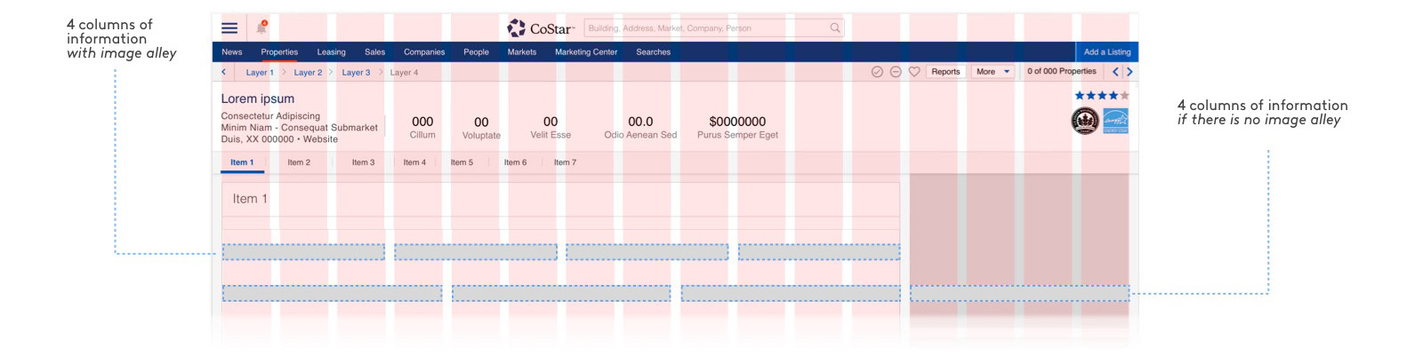We needed a modern, sleek, flexible, and scalable update to unify the appearance of both summary and detail pages within CoStar Suite. Our summary pages consist of a variety of distinct styles and formats of information, including charts, notes, callouts, maps, logos, photos, and more. Managing such diverse elements on a single page poses challenges in achieving a clean and organized design.