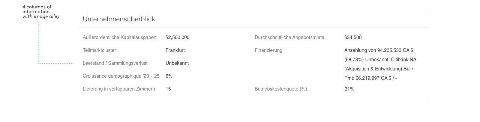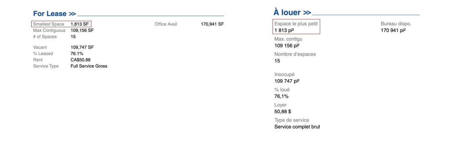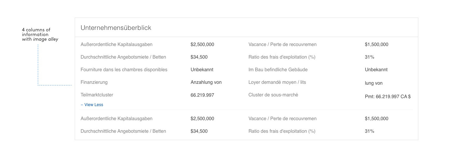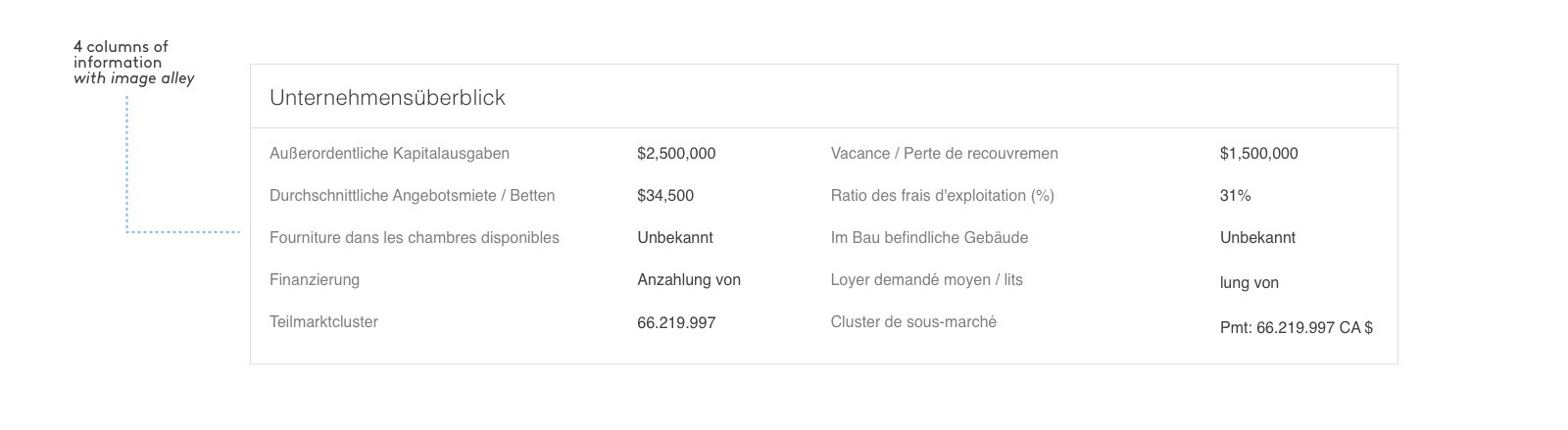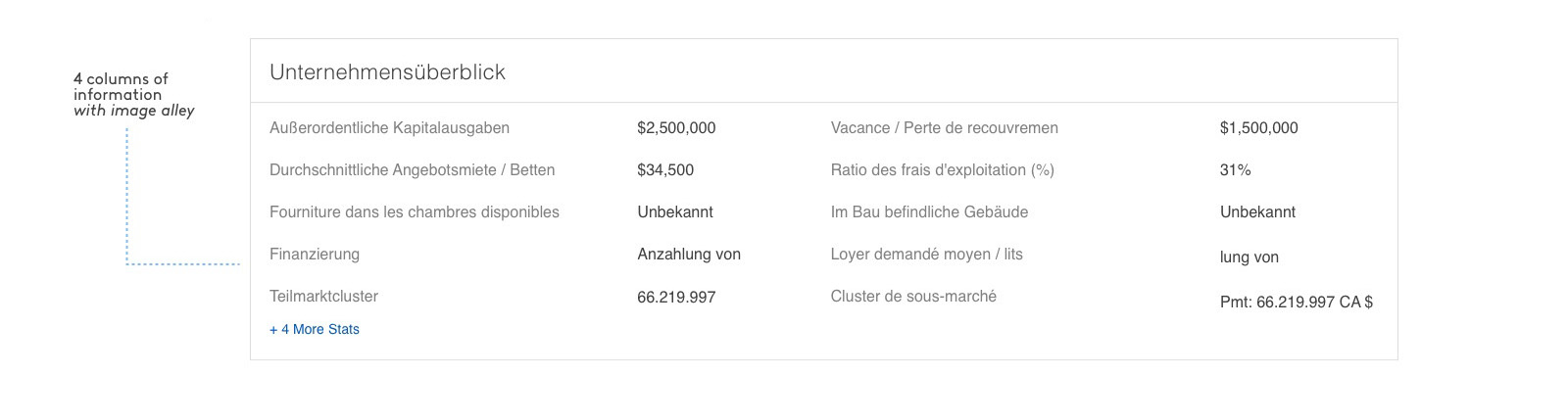 For instance, when translating the current CoStar USA format into French Canadian, a notable adjustment was made. Instead of presenting the title and its corresponding value side by side, we opted to stack them. This alteration was necessary due to the differing lengths of content between languages.Yet, sustaining that approach wouldn't be viable in the long run given the new card design.