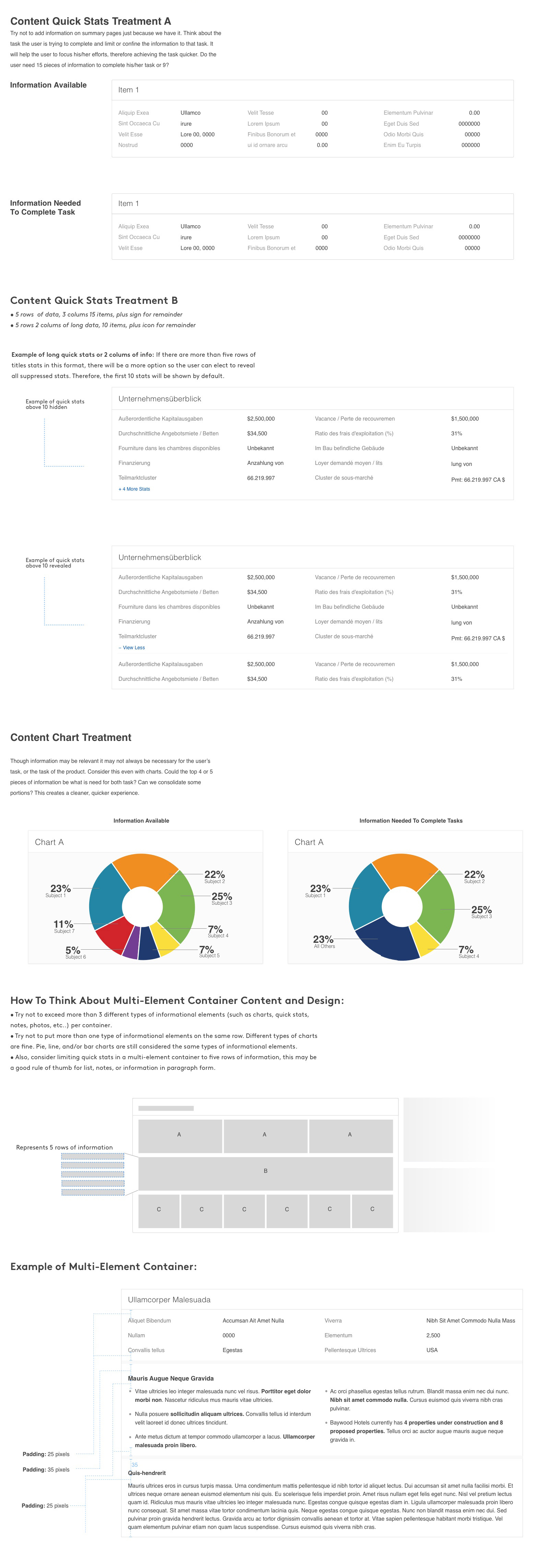 *Consideration “a” should be made for cards with tables but not required. 18 characters max per quick stat item in the first and last text columns 20 characters max per quick stat item in the middle text columns If through language conversion the characters per title increase beyond the prescribed character limits, your information will adopt the “Extended Quick Stat” format. a. My recommendation is to use up to 4 text columns max per card. Each text column will occupy 3 grid columns. If there is “no” image alley, 4 text columns are still recommended, but each text column will occupy 4 grid columns. *Consideration “a” should be made for cards with tables but not required. 32 characters per Quick Stat item in the first and last text columns