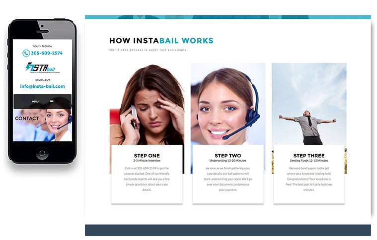 Instabail is a responsive website. This site was designed to be simple, direct and informative. Bail bonds seekers typically have a sense of urgency, therefore the information they seek should be clutter-free and a quick read.